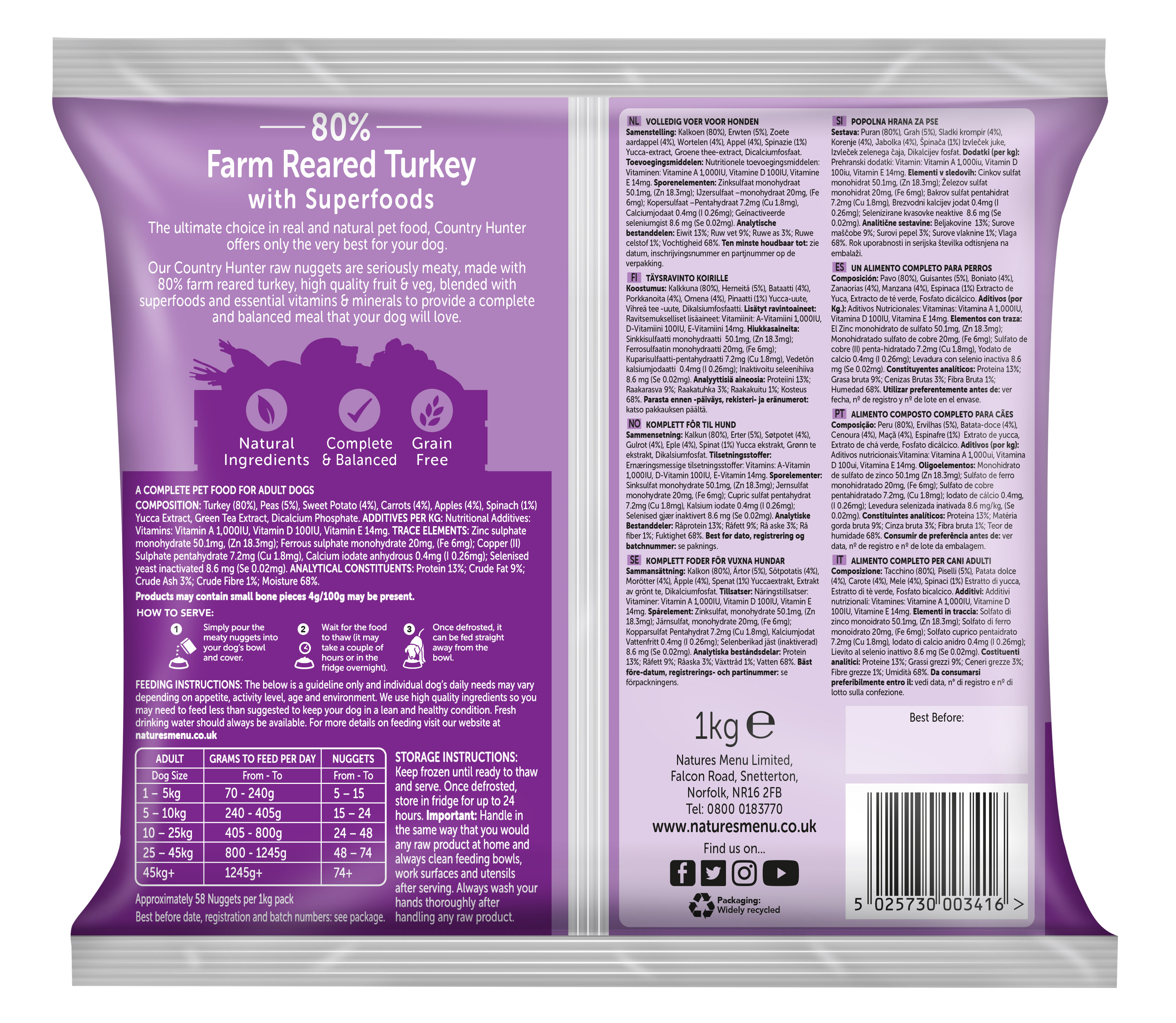 A tasty complete and nutritionally balanced Country Hunter raw meal of Farm Reared Turkey, with a delicious blend of sweet potato, carrots, peas and apples in easy to serve nuggets.